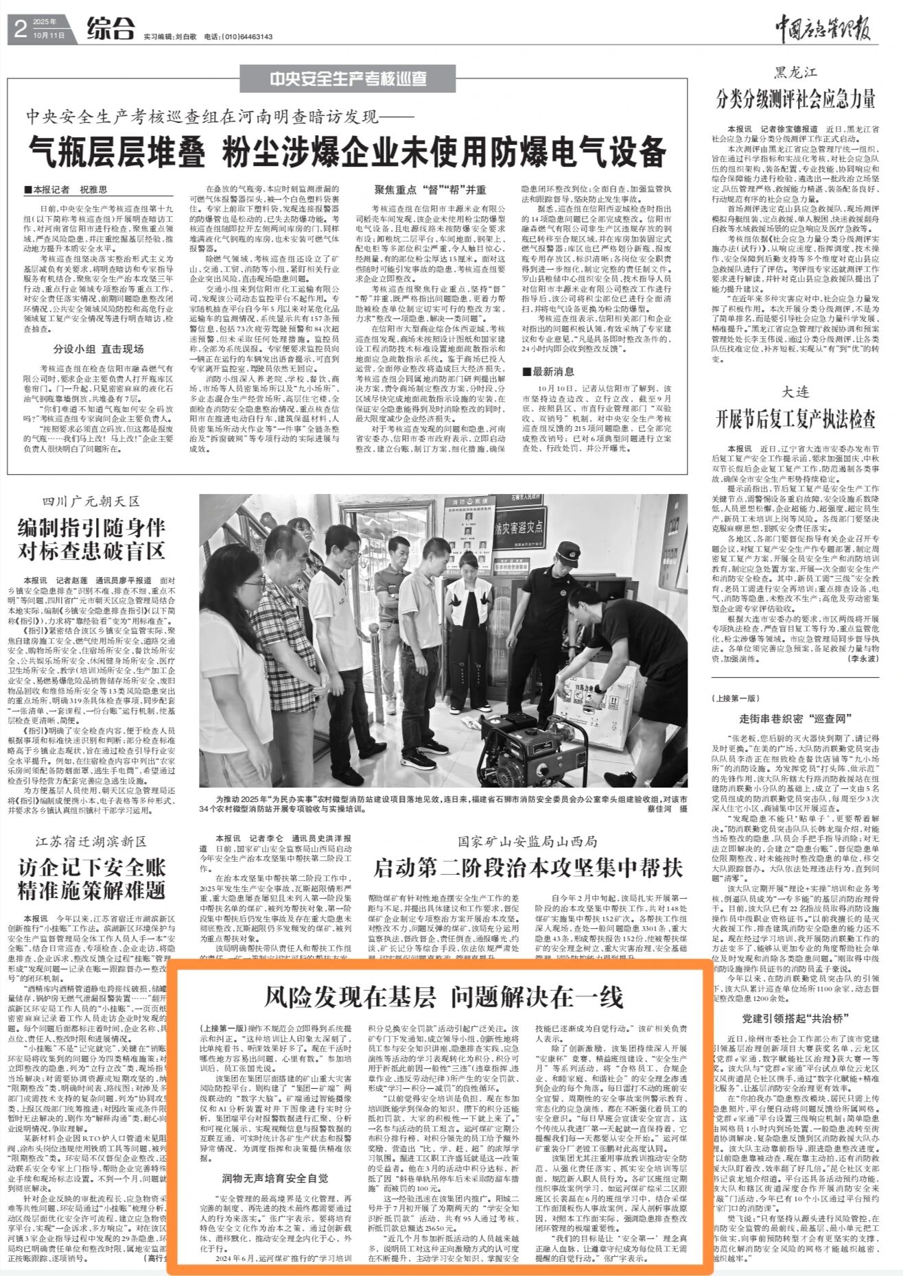 类似的场景在各矿区频频上演。11月6日,金桥煤矿洗煤厂生产班长李强飞在巡查时发现泵房门口有混凝土块坠落,通过对讲机提醒正在附近作业的维修工孔凡听重点检查301皮带栈桥伸缩缝。孔凡听发现了混凝土基础剥落的重大隐患。李强飞、孔凡听等4人获得奖励。“今年1月至7月,我们通过‘三类人’带动一线员工排查出隐患100余条,累计奖励185名员工近2万元,有效激发了基层员工自主排查隐患的积极性。”运河煤矿安监部部长马堂健介绍。